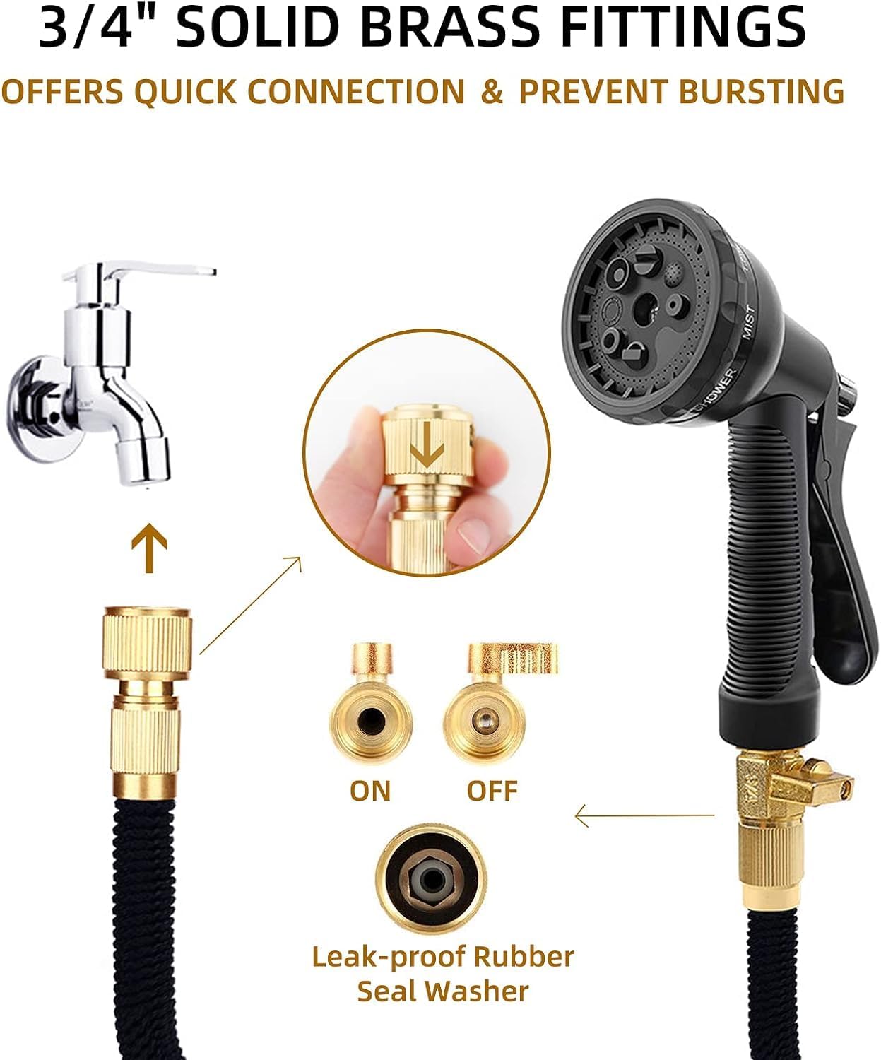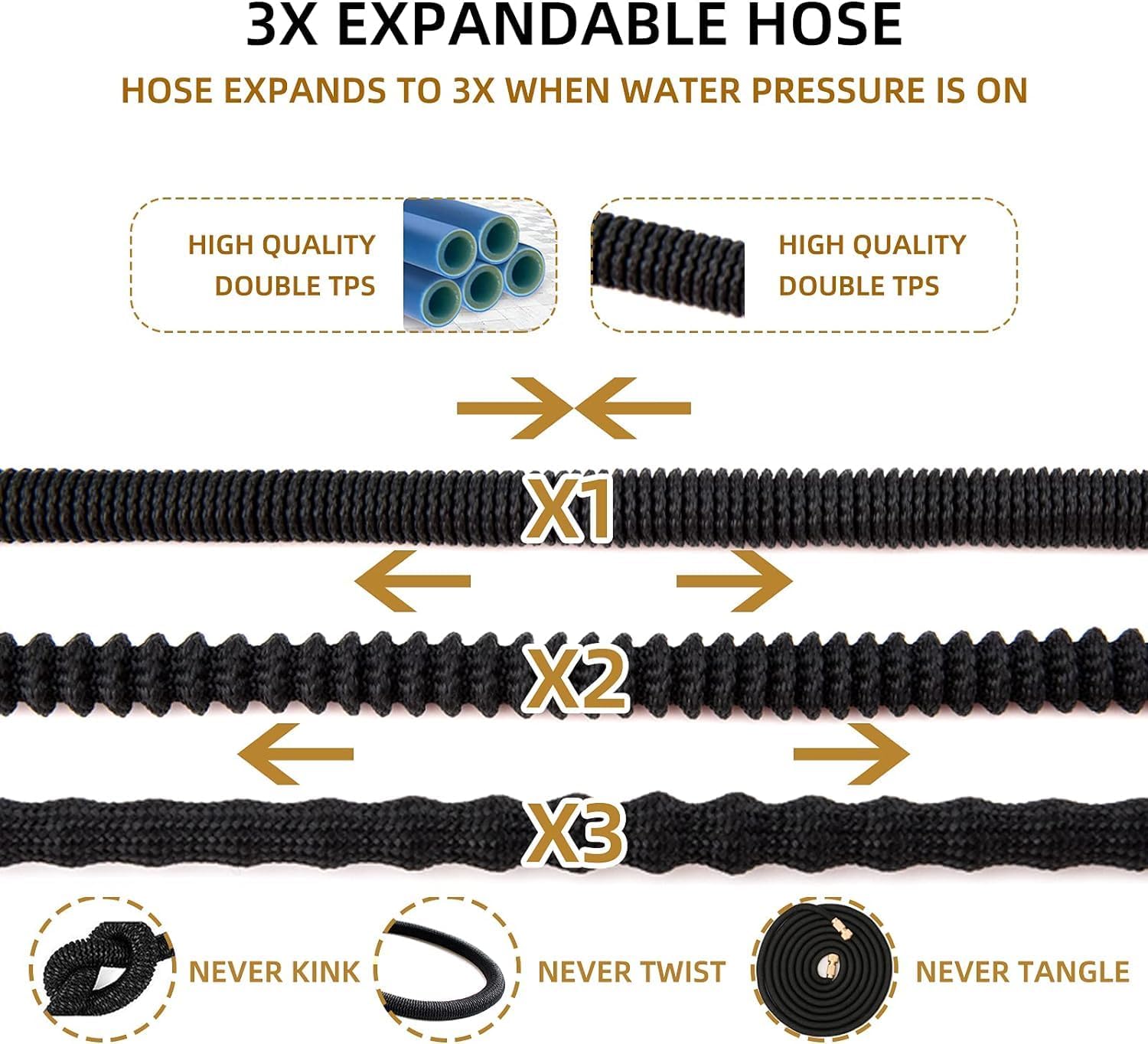 Beim Öffnen des Wasserhahns dehnt sich der Schlauch durch den Wasserdruck auf bis zu 30 Meter (100 ft) aus. Nach dem Gebrauch zieht er sich automatisch wieder zusammen – leicht zu lagern und immer einsatzbereit.