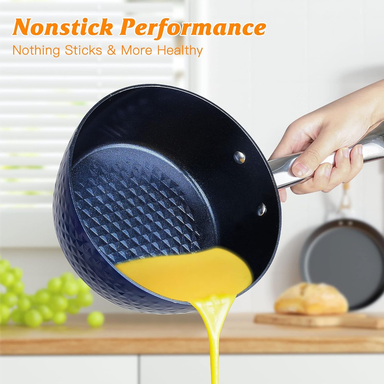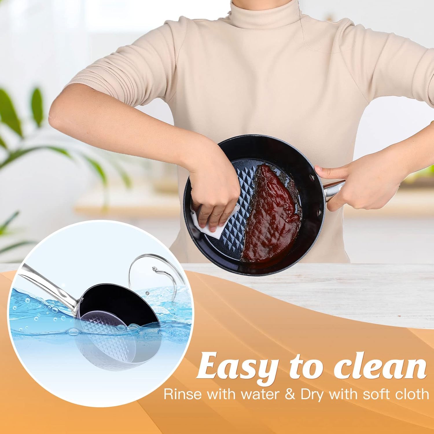 Antihaft & Induktion: RAINBEAN Auflauftopf aus robustem Aluminium mit 3,2 mm verstärktem Rand für ein flüssigkeitsfreundliches Kochen ohne Überlaufen. Ideal zum Erwärmen von Soßen, Zubereiten von Ramen, Haferbrei oder Spaghetti mit Fleischbällchen.
