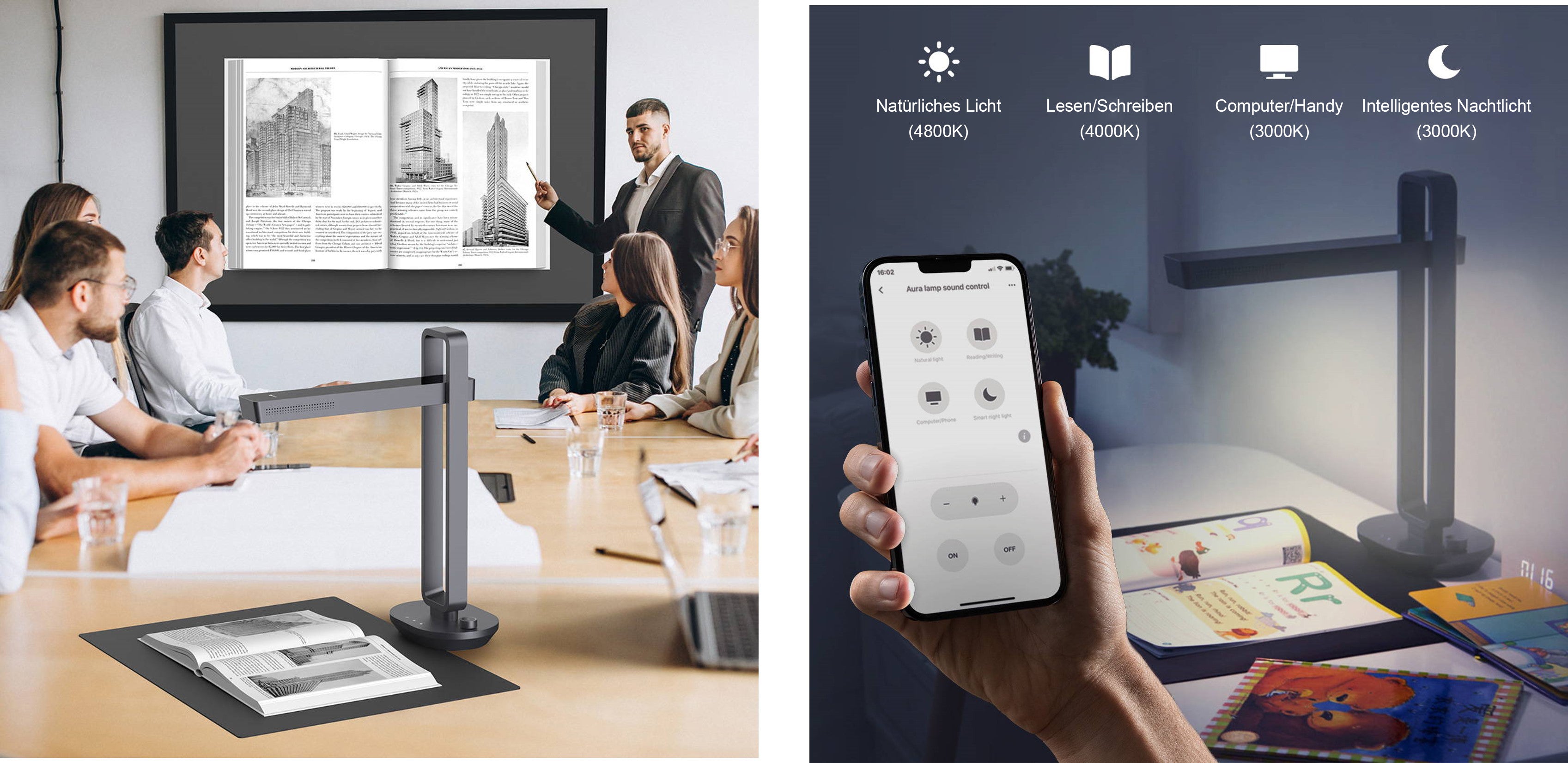 Passt den ganztägigen Beleuchtungsbedarf. Bei Nichtgebrauch platzsparend zusammenklappbar. Der Buchscanner der AURA-Serie ist ein faltbares Gerät mit Doppelfunktion, das nach Abschluss der Scanaufgabe als intelligente Leuchte dient. Er wurde entwickelt, um die Ermüdung der Augen zu reduzieren und ein qualitativ hochwertiges Licht mit geringer Blendung und geringem optischen Flimmern zu liefern.