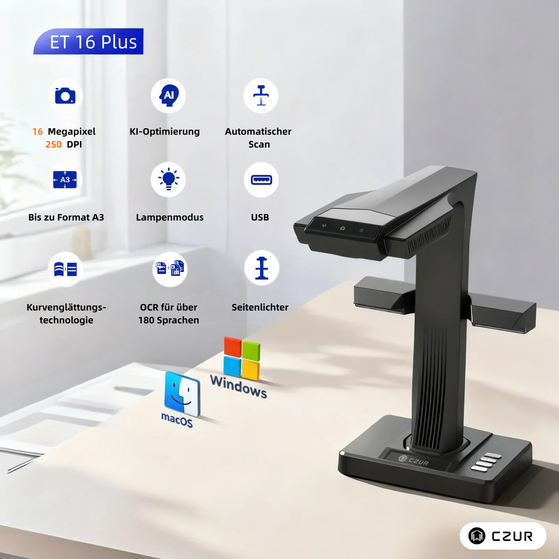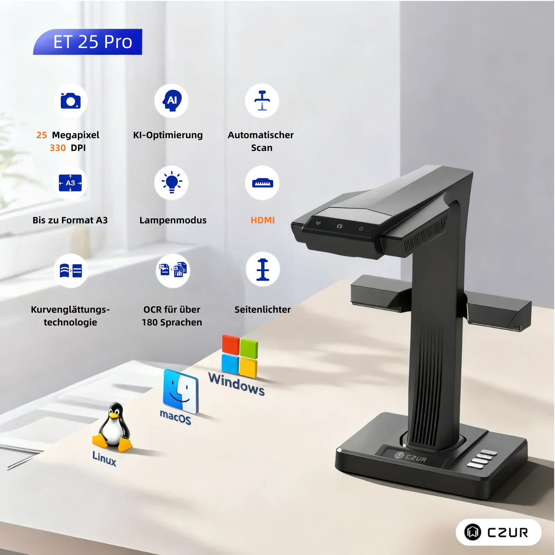 Die CZUR ET-Serie ermöglicht das schnelle und schonende Digitalisieren von Büchern und Dokumenten bis A3-Format – ganz ohne Aufschneiden oder Entheften. Dank patentierter Book Curve Flattening™-Technologie, präzisem Lasersensor und OCR-Funktion entstehen gestochen scharfe, editierbare Scans in nur 1,5 Sekunden pro Seite. Ideal für Bücher, Zeitschriften, Verträge und vieles mehr.