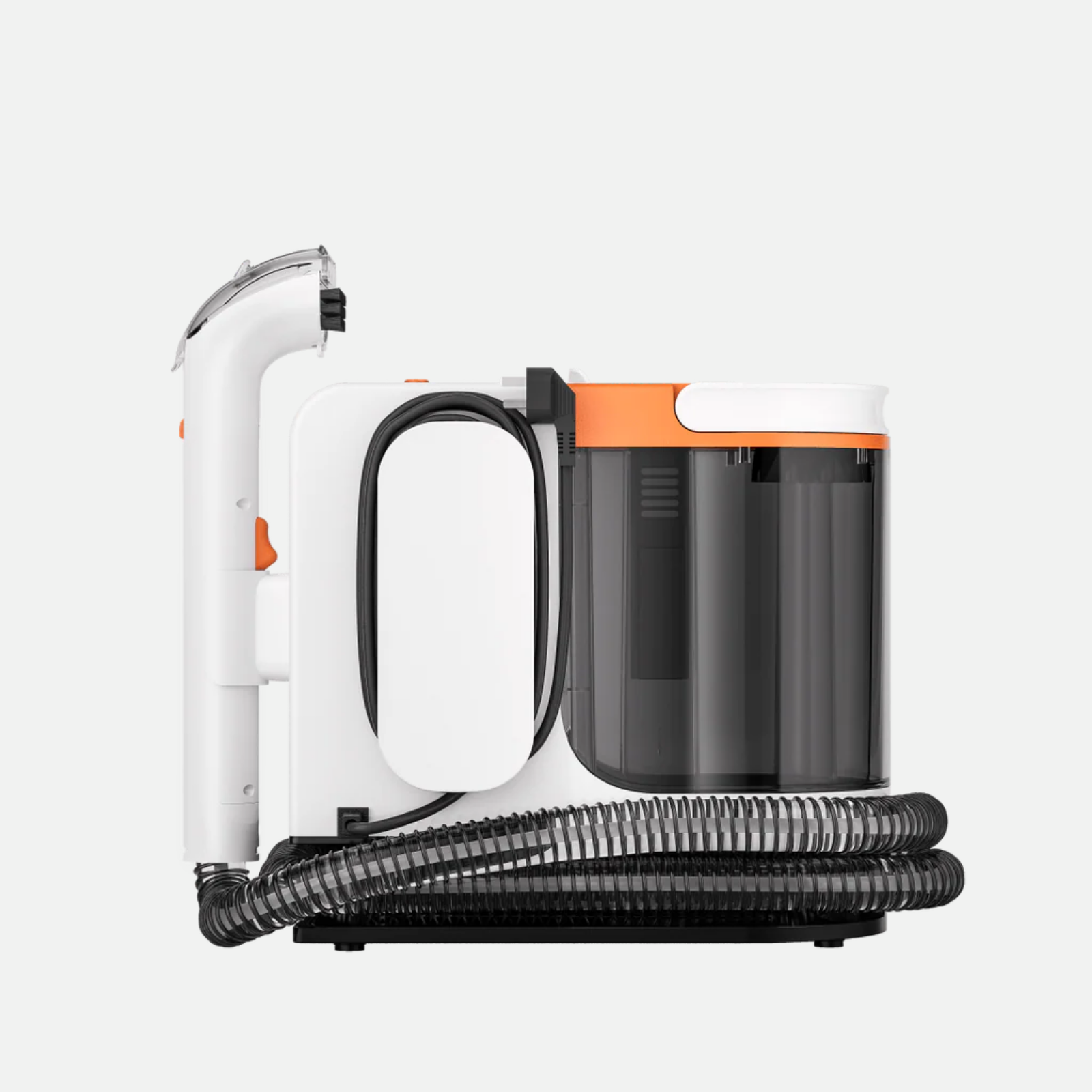 Compact carpet cleaner with white, orange, and transparent black components and coiled hose