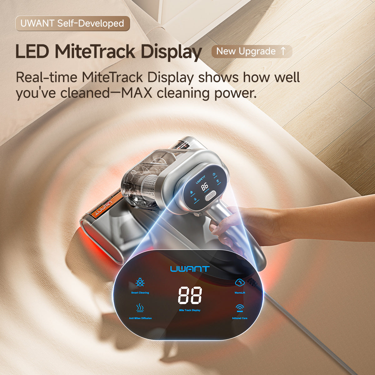 Pantalla inteligente & Limpieza de áreas grandes Equipado con un Pantalla LED de seguimiento de ácaros en tiempo real Para una demostración visual del efecto de limpieza y para garantizar el máximo poder de limpieza con cada uso. Mejorado por un Motor un 40% más potente y una gran cubierta de limpieza para una limpieza rápida de grandes áreas en diversos textiles del hogar.