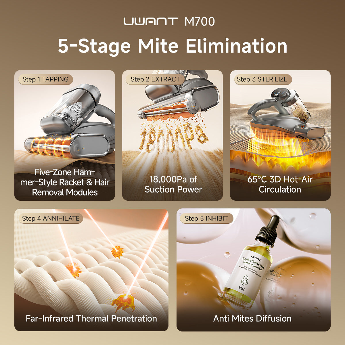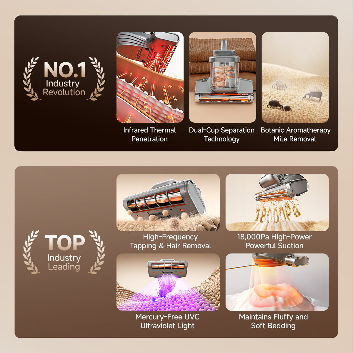 Innovación industrial & tecnología autorizada Integra varias tecnologías líderes en la industria, incluidas Penetración de calor por infrarrojos lejanos, esterilización UVC sin mercurio y supresión de ácaros basada en ultrasonidos – para la eliminación profesional de ácaros y el cuidado higiénico y seguro de los textiles.