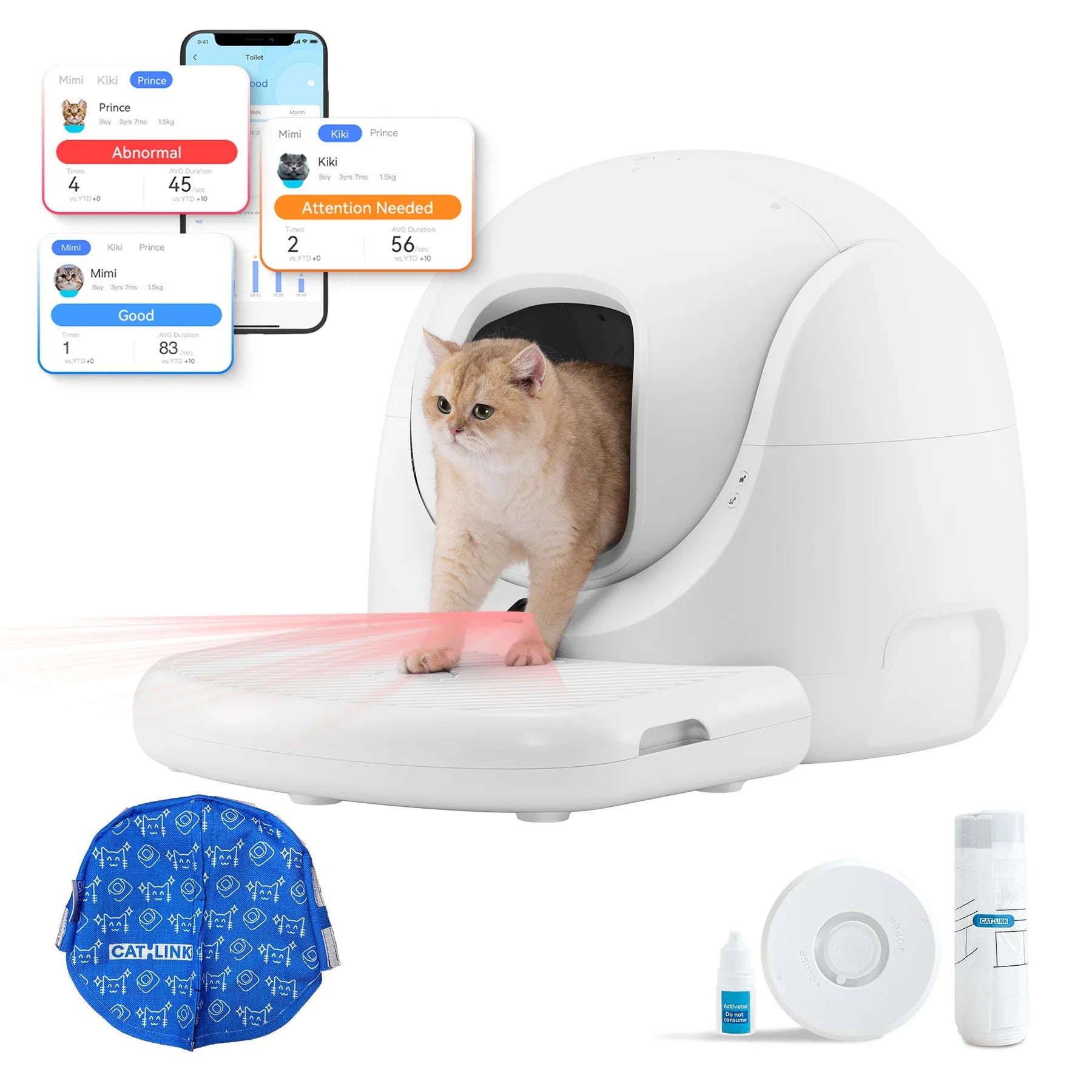 - Capteur de poids & Surveillance de la santé : Reconnaît l’utilisation de chaque chat et aide à détecter les changements tôt.