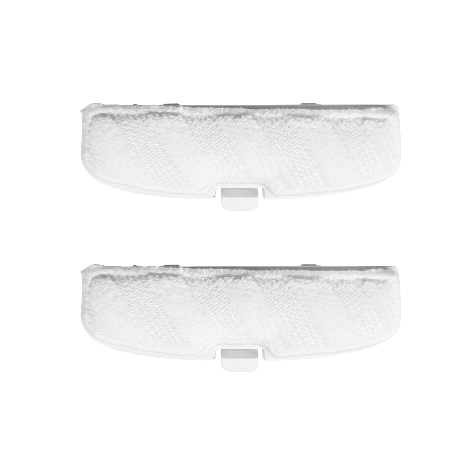 Two white microfiber replacement mop pads with textured surfaces for cleaning devices